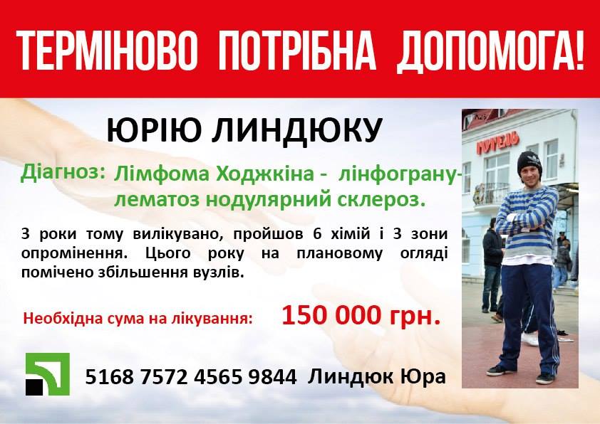 28-річному коломиянину Юрію Линдюку терміново необхідна допомога. Лікарі поставили йому діагноз: лімфома Ходжкіна.