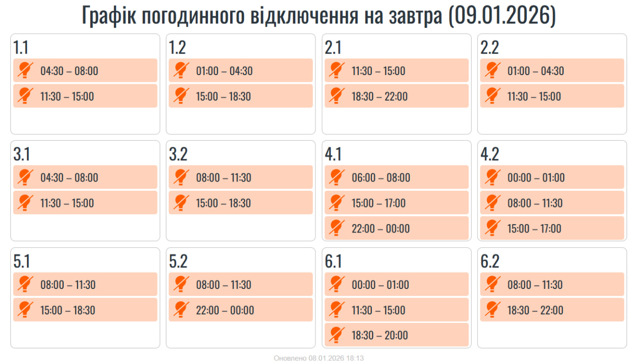 У п'ятницю, дев'ятого січня, на Прикарпатті діятимуть графіки погодинних вимкнень електроенергії.