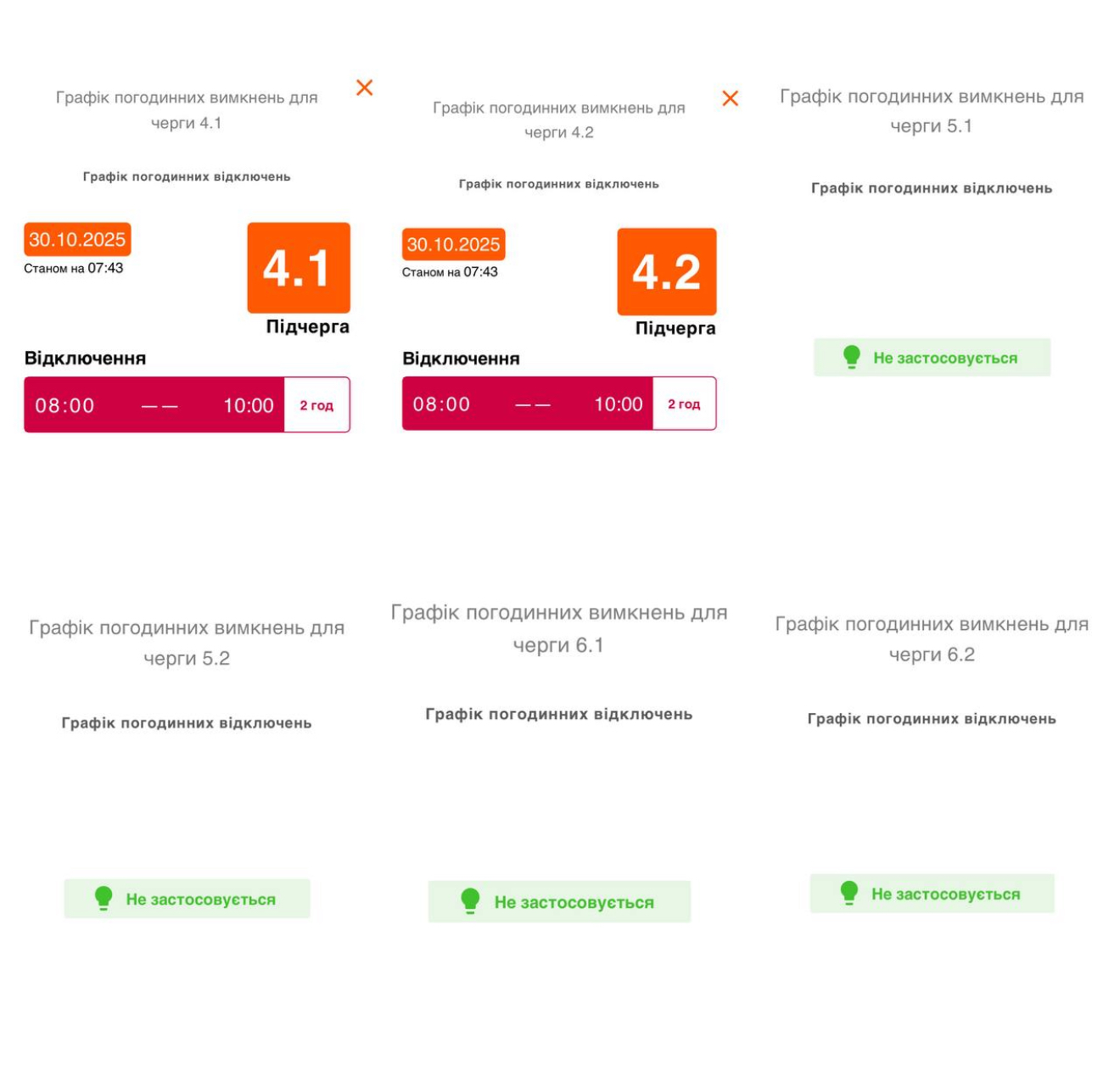 Також застосовуватимуть одну чергу графіків погодинних вимкнень (ГПВ) для побутових споживачів з 8:00 до 10:00 та з 14:00 до 19:00.