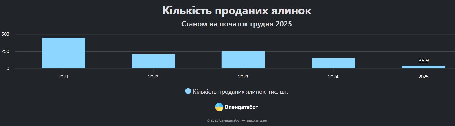 Утім попит на живі новорічні дерева падає ще швидше, аніж пропозиція. Так, лише 39,9 тисячі ялинок продали в Україні станом на середину грудня 2025 року.