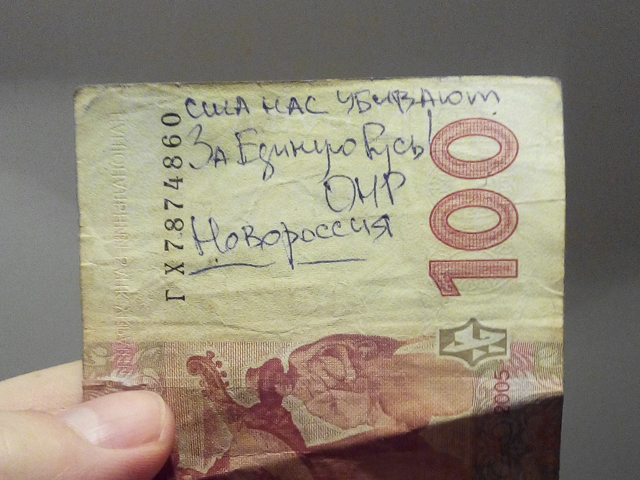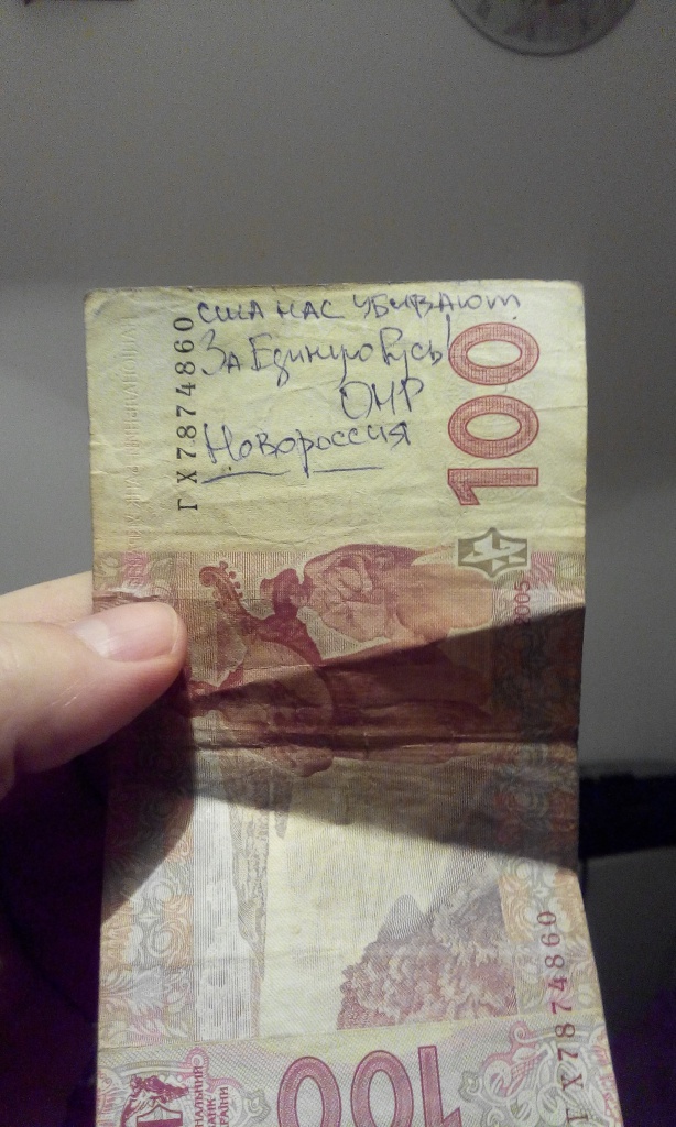 На одній зі сторін, поряд із портретом Тараса Шевченка, напис: "США нас убивают. За единую Русь! ДНР Новороссия", інформує НТК.