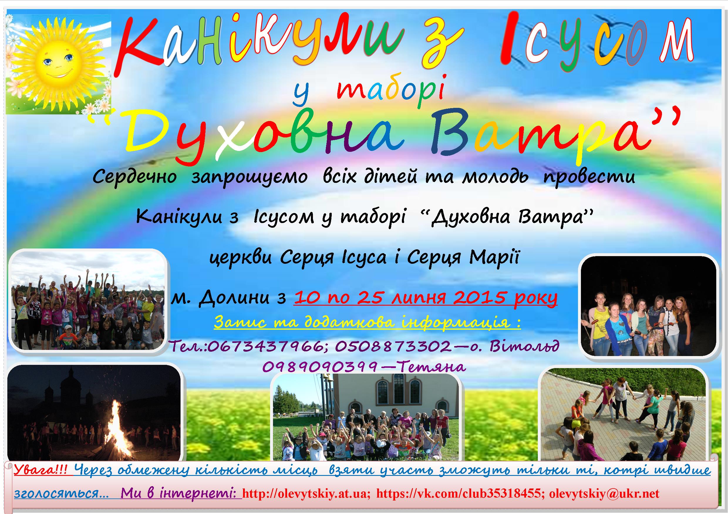 Парафія Серця Ісуса і Серця Марії м. Долини Івано-Франківської Митрополії УГКЦ запрошує усіх дітей та молодь на Канікули з Ісусом у таборі “Духовна Ватра”, який проходитиме з 10 по 25 липня.