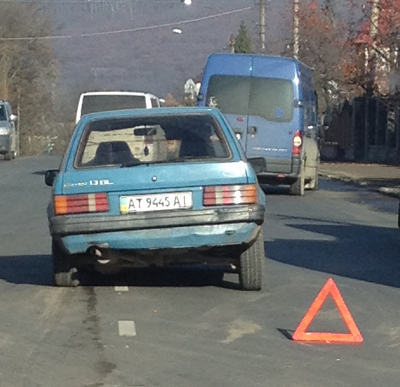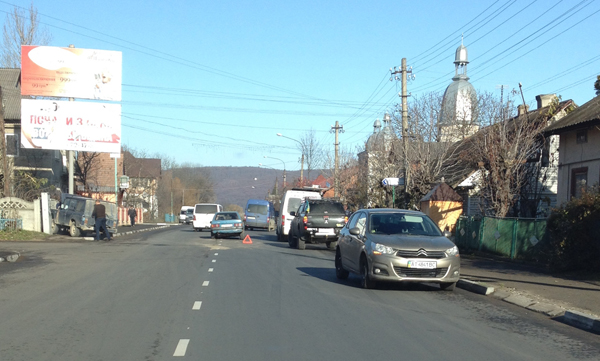 Сьогодні на вулиці Соборна в місті Надвірна трапилася дорожньо-транспортна пригода за участі двох іномарок, які не змогли роз‘їхатися на перехресті вул. Січових Стрільців та вул. Соборна.