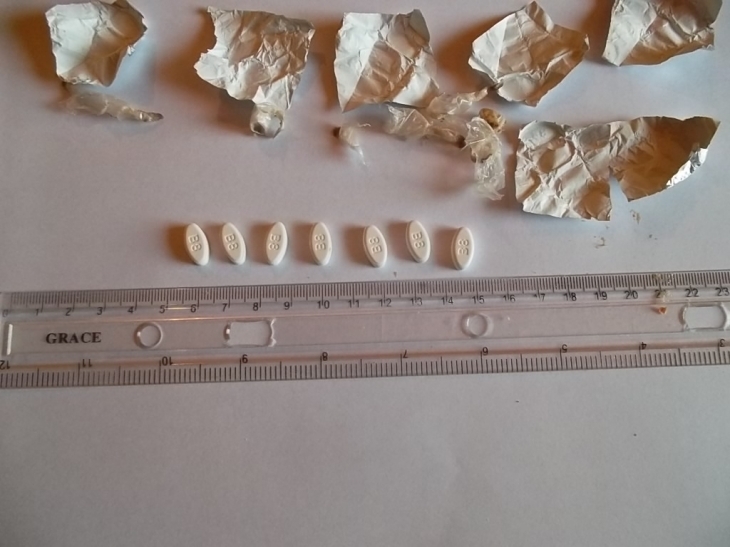 У згортках знаходилися сім таблеток білого кольору із надписом В8. Таблетки були приховані в печеві із начинкою.