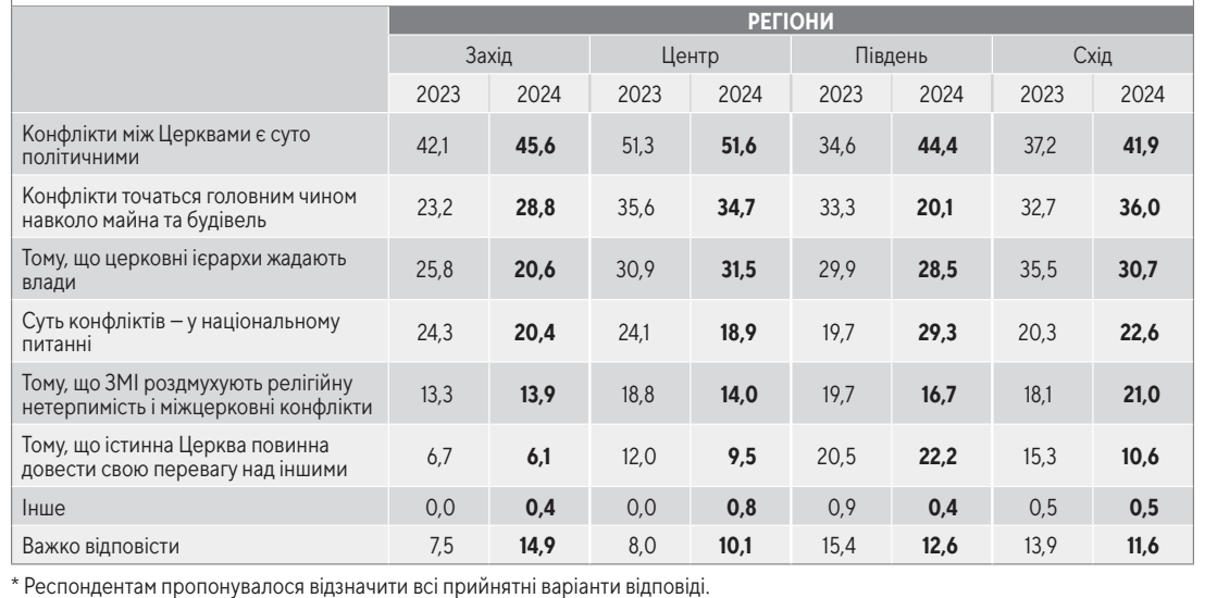 Ще 28,8% опитаних відповідають, що «конфлікти точаться головним чином, навколо майна та будівель». 20,6% респондентів із заходу бачать джерело конфліктів у тому, що «церковні ієрархи жадають влади».