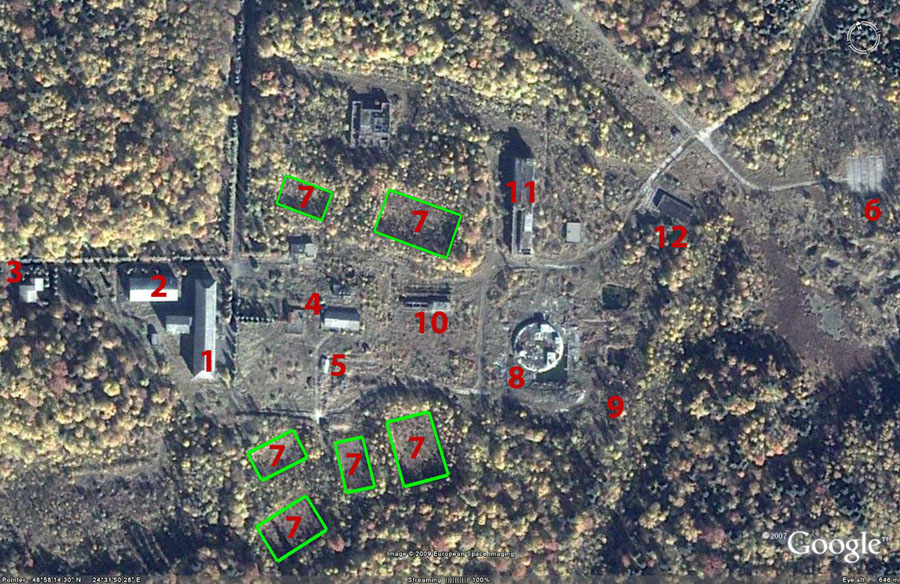 1. Штаб 2. Готель 3. Котедж для вищого військового командування 4. Старий ЗКП 5. Запасний вхід в старий ЗКП 6. Вертолітна площадка (знаходиться за охоронним периметром об'єкта)