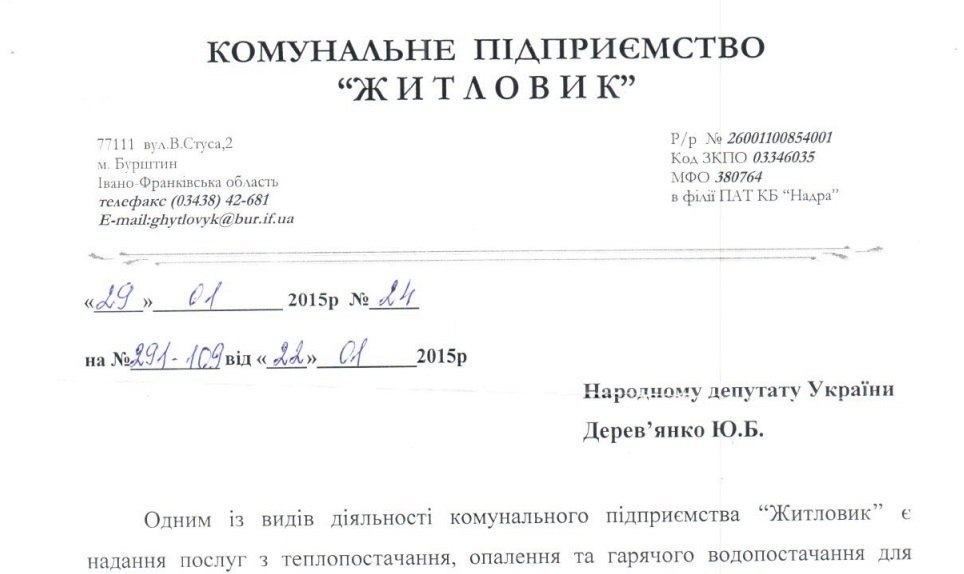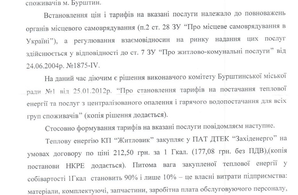 "КП "Житловик" купляє теплоенергію в Бурштинської ТЕС за вартістю 212 грн за 1 Гкал, а продає мешканцям міста за 287 грн. КП "Житловик" мало б робити націнку не більше 10 %, тобто мешканці міста мали б платити 233 гривні, а не 287 гривні", - розповіла Галабала, і додала, що "ВОЛЯ" направила звернення до комунального підприємства, щоб вияснити причини завищення тарифів.