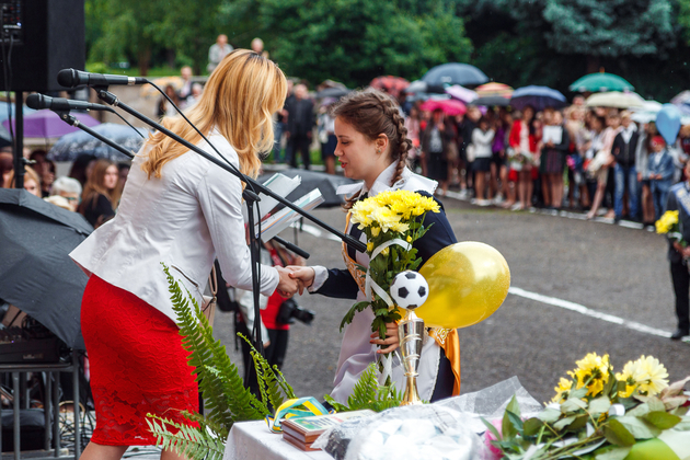 Випускниця Аня Савчук, яка також отримала нагороду під час сьогоднішнього свята, каже, що хоче жити в Україні без війни і корупції. Дівчина зізнається, що поки з вибором професії не визначилась, але уже думає над цим: