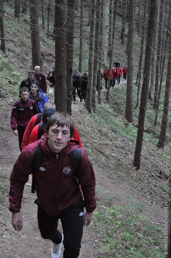Спортивний директор "Урагану" Роман Ярий представляє усім провідника Андрія. Почалося все лісовою стежиною. Далі - кам’янисте устя гірської річки. Максим Аветисян в "Урагані" півроку, але в Карпатах - вперше. "Маю багато вражень, все дуже сподобалося, - каже 21-річний футзаліст. - Природа, краєвиди, водоспад - все просто чудове. Шлях, звісно, був складний, ми втомилися, але йшли до кінця, до перемоги. В кінці ми скупалися у водоспаді, це додало сил, і ми пішли далі. Мені здається, що сьогодні ми краще пізнали один одного, команда стала більш згуртованою". Півтори години ходьби і ось він перший привал - на лісовій галявині. З галявини знову "пірнаємо" у ліс. Біля карпатського джерела. Від гірської полонини перехоплює подих. Фото на пам’ять. Біля гірської каплички. Підніжжя Синяка. Краєвиди зі скелястих схилів. Попереду - Синяк. Під ногами - великі й маленькі валуни. Йти все важче, але спортсмени ніби й не бачать їх. І ось - вершина (фото Олекси Бутчака). Вниз "Ураган" збіг швидше, ніж підіймався. Можливо й тому, що внизу за маршрутом футзалістів чекав водоспад Гук.