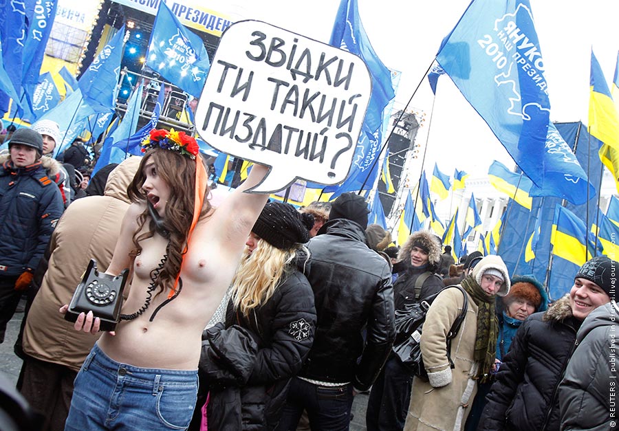 25 лютого у телепроекті Віктора Януковича «Розмова з країною» взяли участь активістки руху FEMEN, які поставили президенту України своє питання руба.
