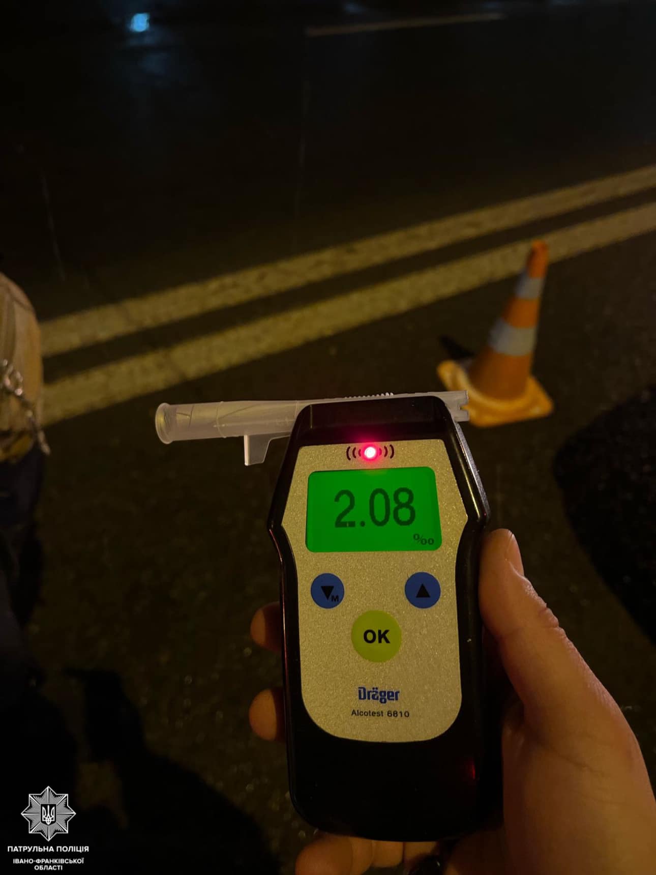 Спілкуючись з водієм ВАЗ, патрульні виявили у нього ознаки алкогольного сп'яніння. Водій пройшов освідування на місці. Результат — 2.08 проміле. Окрім того, у чоловіка було відсутнє посвідчення водія.