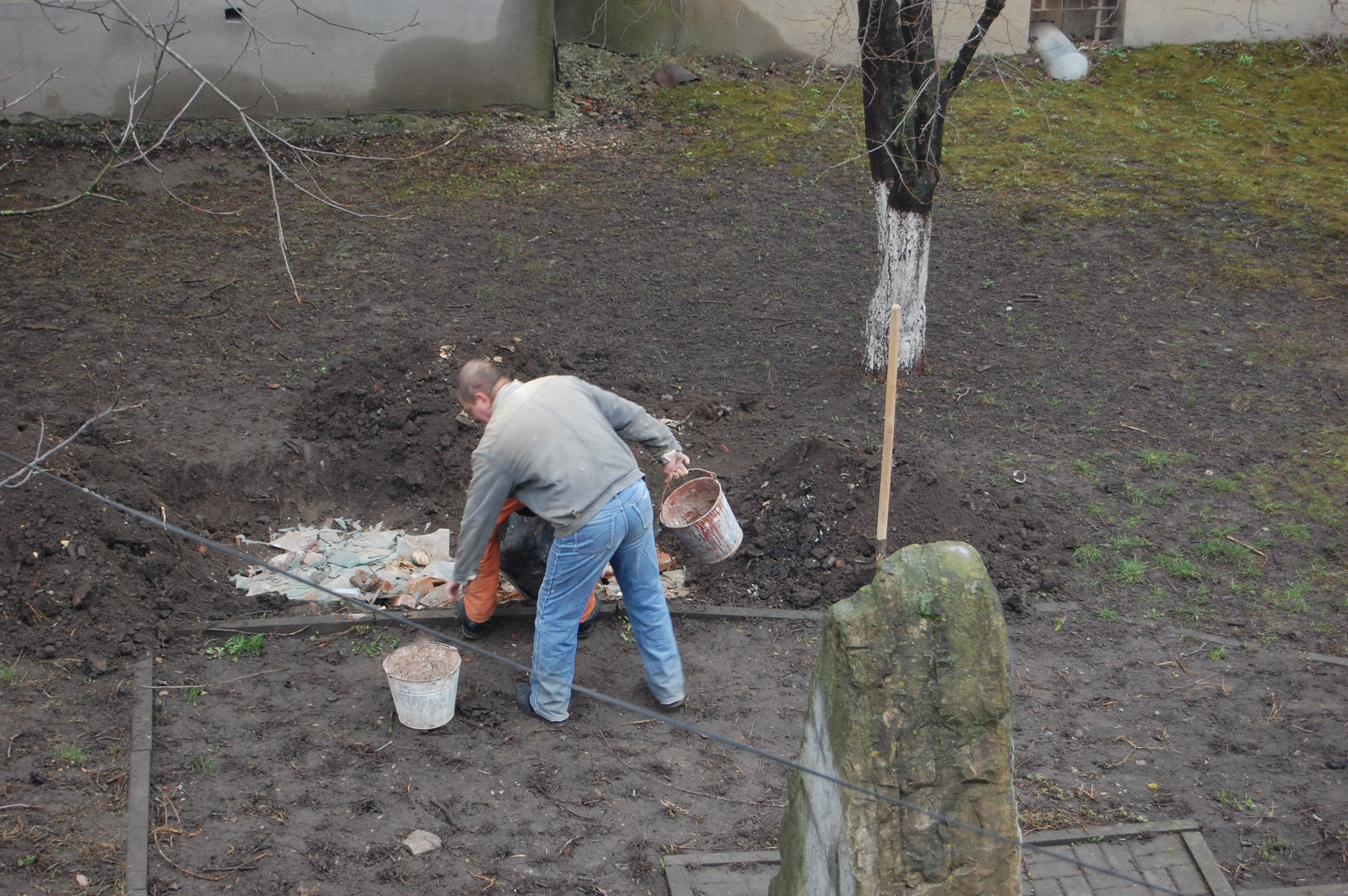 Двоє технічних працівників навчального закладу на території могили, де колись були знайдені закатовані жертви комунізму, спершу викопали яму.