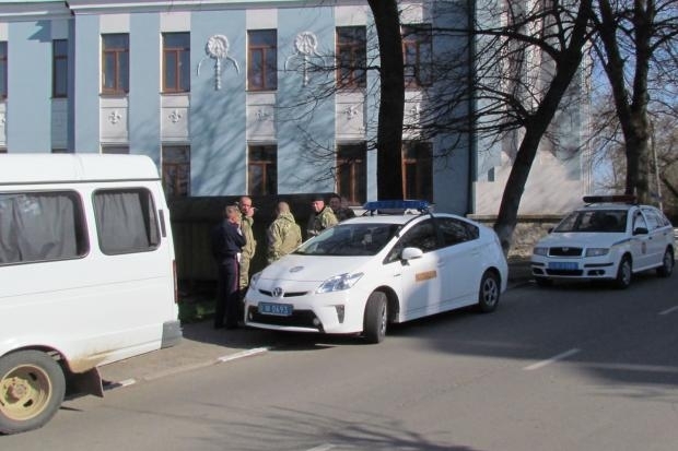 Навпроти пам’ятника Тарасові Шевченку розташувалися дві міліцейські машини і білий бус. Чоловіки у камуфляжах із шевронами МВС спілкуються охоче, проте про мету свого перебування не говорять.