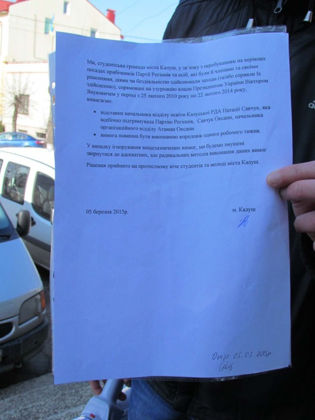 Студенти кількох калуських начальних закладів сьогодні, 5 березня, вручили керівництву Калушської РДА вимогу звільнити з посад "прибічників Партії регіонів", які досі працюють у владі.