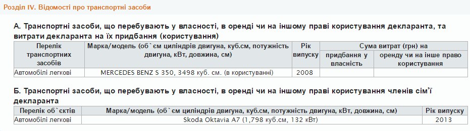 Депутат їздить на Mercedes-Benz S 350, 2008 року випуску, його дружина – на машині Skoda Oktavia A7, 2013 року випуску.