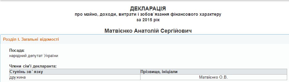 Дружина Матвієнка отримала дохід розміром у 805 тисяч 352 гривні.
