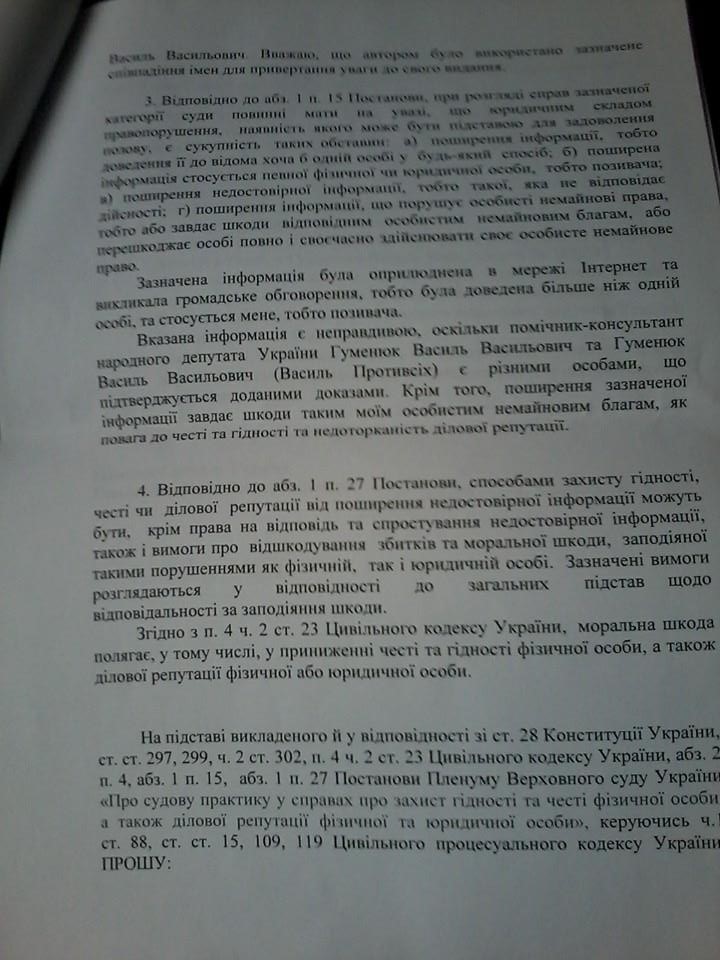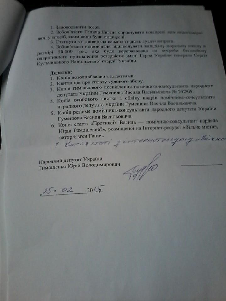 "Народний депутат Юрій Тимошенко подав на мене до суду. Вимагає спростування та 50 тисяч гривень. Спростування я не роблю, бо не стверджував. А інформацію по Гуменюку опублікував, як і обіцяв. До зустрічи у суді", - написав Гапич.