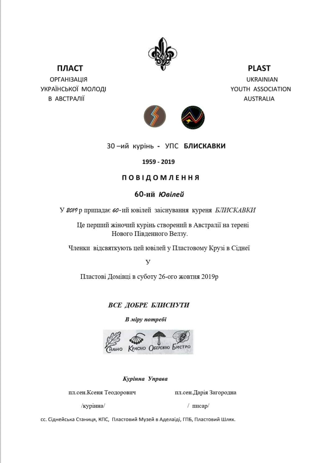 "Куреню «Блискавки» виповнюється 60 років. Він виник в Австралії у 1959 році. Курені - це об’єднання людей за інтересами. Кожен курінь має свою спеціалізацію. Наш курінь «Блискавки» займається благодійністю. А все починалося так: у 1950 р. пластунки, які прибули з Німеччини до Австралії, почали знайомитись між собою, знаходити нові контакти й внаслідок цього дівчата започаткували юнацький гурток «Блискавки». У 1959 р. юначки з гуртків «Кобри», «Калина» та «Блискавки» вирішили об'єднатися та створити курінь. Назву обрали «Блискавки» - вона віддзеркалювала характер дівчат," - розповіла Віта Дідик, референт медіа станиці Івано-Франківськ.