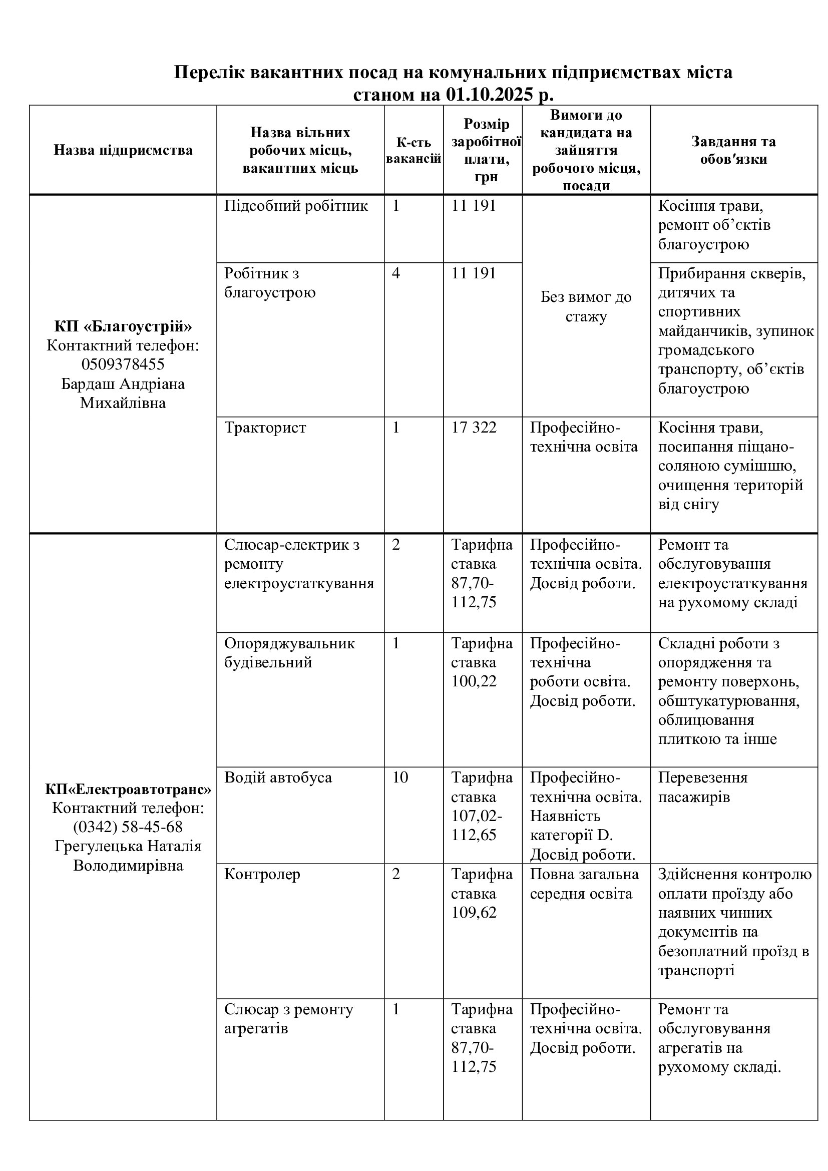 Серед вакантних посад: трактористи, робітники з благоустрою, машиністи, водії, слюсарі, соціальні працівники, бухгалтери, електрики, агрономи, двірники та інші.