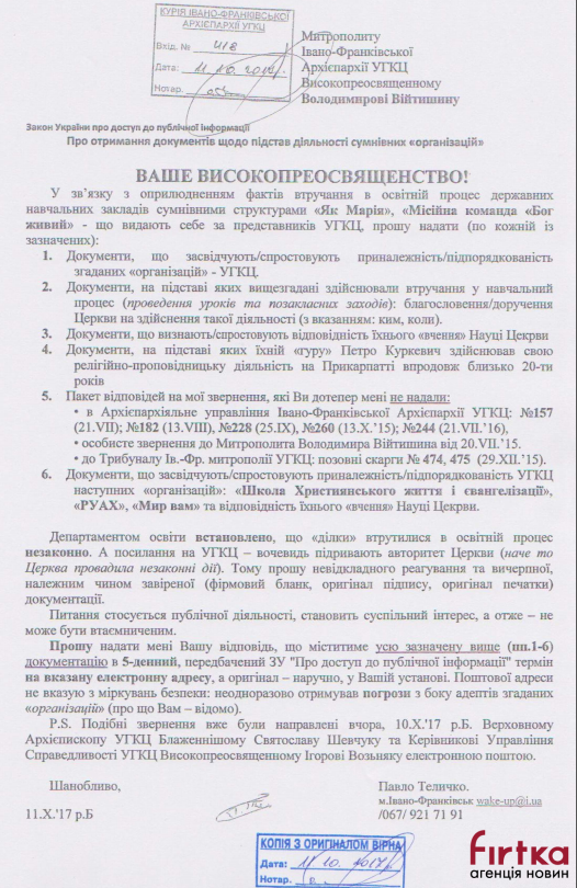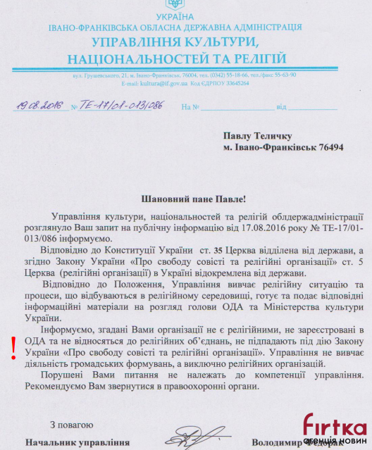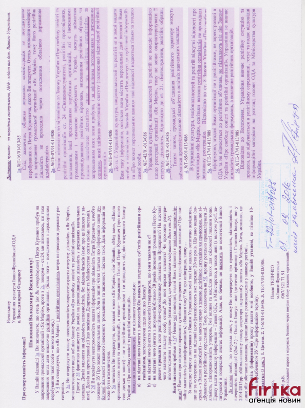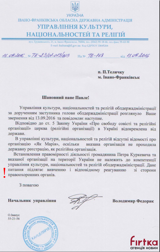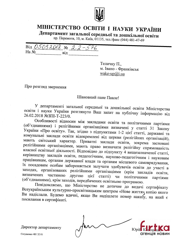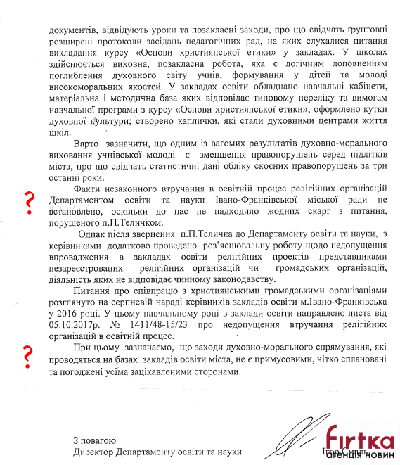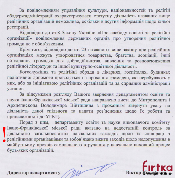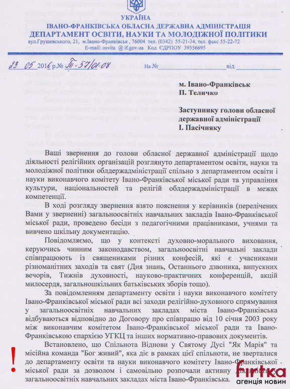 Неначе посадовець забув, як Департаментом освіти ІФ ОДА "Встановлено, що спільнота віднови у Святому Дусі "Як Марія" та місійна команда "Бог живий", яка діє в рамках цієї спільноти... самовільно розпочали активну діяльність у загальноосвітніх навчальних закладах міста Івано-Франківська." (№Т-57/01-08 від 23.05.16) "...вказано на недостатній контроль за діяльністю загальноосвітніх навчальних закладів ... та зобов'язано вжити заходів щодо недопущення в майбутньому проявів самовільного втручання у навчально-виховний процес будь-яких організацій" - завершує свій лист Директор департаменту п.Віктор Кімакович.