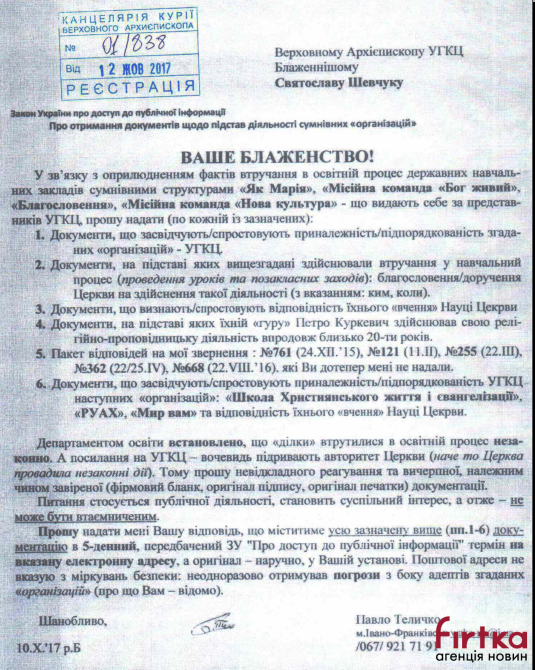 Листом №ТЕ-17/01-013/086 Управління культури ІФ ОДА ствердило, що "згадані Вами організації не є релігійними, не зареєстровані в ОДА та не відносяться до релігійних об'єднань, не підпадають під дію Закону України "Про свободу совісті та релігійні організації". Виходить: мережа ввела в оману навіть офіційні державні органи: адже проводить щотижневі збори релігійного змісту (здійснює специфічний релігійний обряд - т.зв. "прослава"). Позиціонує себе як релігійна, має духівника (що на письмі потвердив статус і мету діяльності) та асоціює себе з УГКЦ. Останнє, як прокоментувала працівник міської освіти п.Л.Савка, дало можливість "ділкам" безперешкодно входити до шкіл міста. Проте ані Івано-Франківська архієпархія УГКЦ (№418 від 10.10.2017), ні Верховний Архієпископ УГКЦ (№838 від 12.10.2017) не підтвердила приналежність до себе зазначеної "структури" та відповідність їхніх "наук" науці Церкви. Про якість та зміст "наук" вже було написано в матеріялі "Небезпека, що іде від сект" ("Західний Кур'єр" №36 від 07.09.2017).