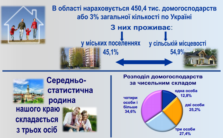 Середньостатистична сім’я складається з трьох осіб. Найпоширенішими в області залишаються сім’ї з чотирьох осіб та більше (34.6%).