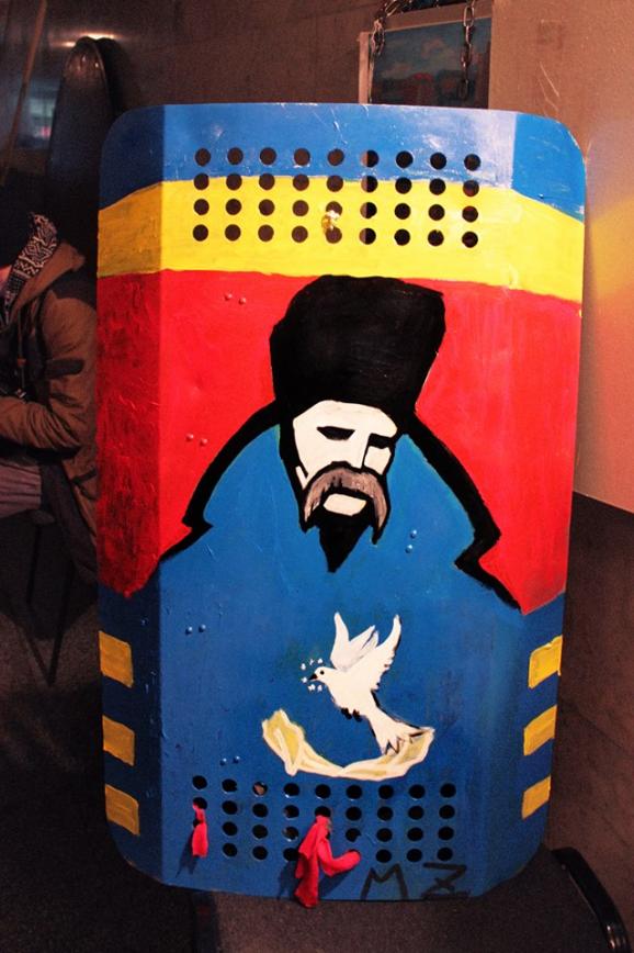 Зокрема з переходом протистояння у більш жорстку фазу, Шевченко з'явився і на щитах самооборони Майдану.