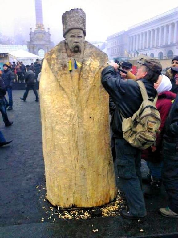 Вже після перемоги революції, просто на Майдані, майстри різьби по дереву перетворили матеріал під дрова у скульптуру. Увіковічнити знову вирішили Тараса Григоровича.