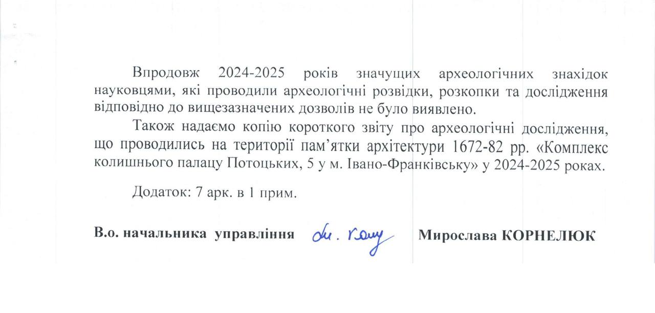 До відповіді також додали звіт про археологічні дослідження на території комплексу колишнього Палацу Потоцьких в Івано-Франківську, які проводилися у 2024–2025 роках.