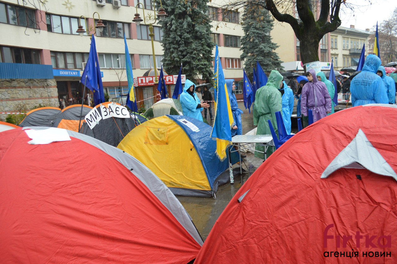 Одними із перших на майдан вийшли іванофранківці. Ще вночі кілька активістів розклали невелике наметове містечко, яке з кожним днем розросталось.