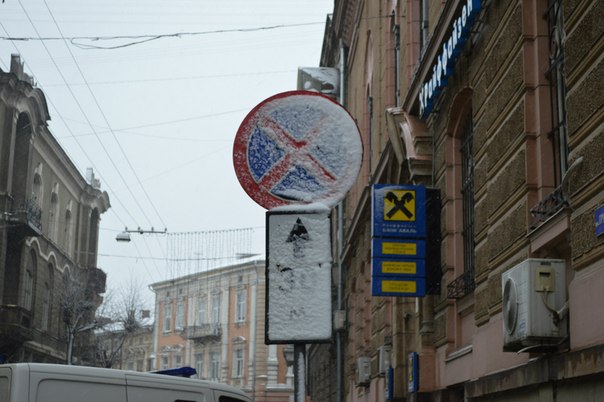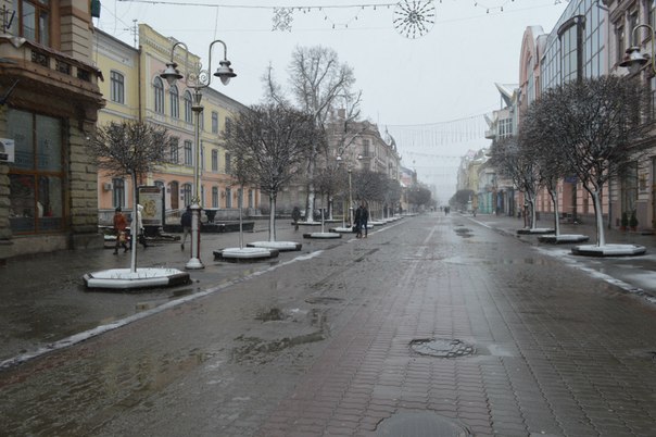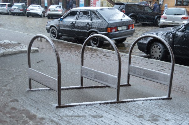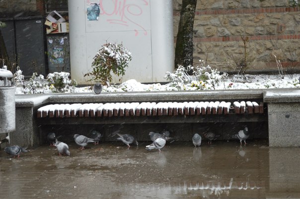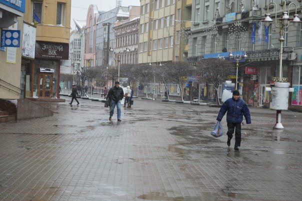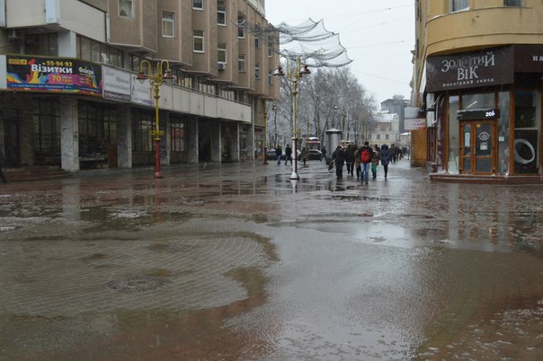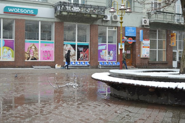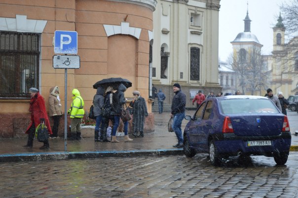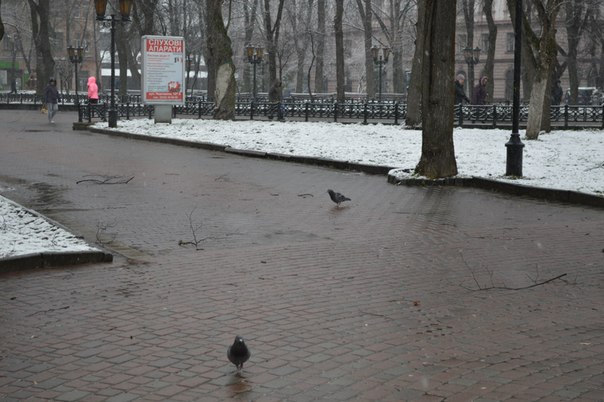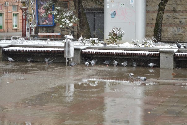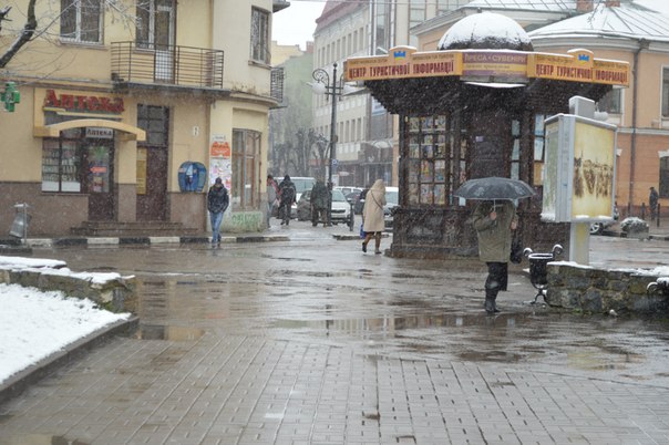 Франківці захищаються від мокрого снігу та вітру капюшонами та парасолями. Птахи ж шукають сховок під лавочками.