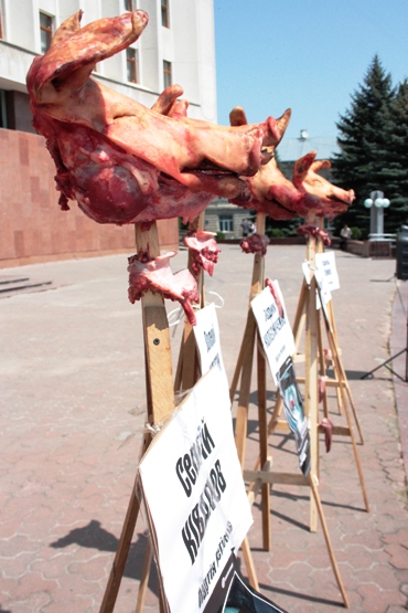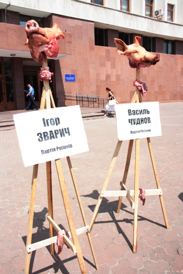 Насилені на дерев’яні палі свинячі голови із відрізаними язиками символізують депутатів із Прикарпаття, а аткож головних регіоналів, які вчора віддали свої голоси за антиукраїнський закон: Сергій Кивалов, Валерій Келестин, Вадим Колесніченко, Володимир Личук, Ігор Зварич, Василь Чуднов.
