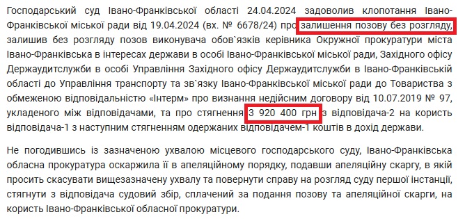 У 2024 році Івано-Франківська обласна прокуратура подала позов із вимогою визнати договір недійсним і повернути 3,92 млн грн до бюджету.