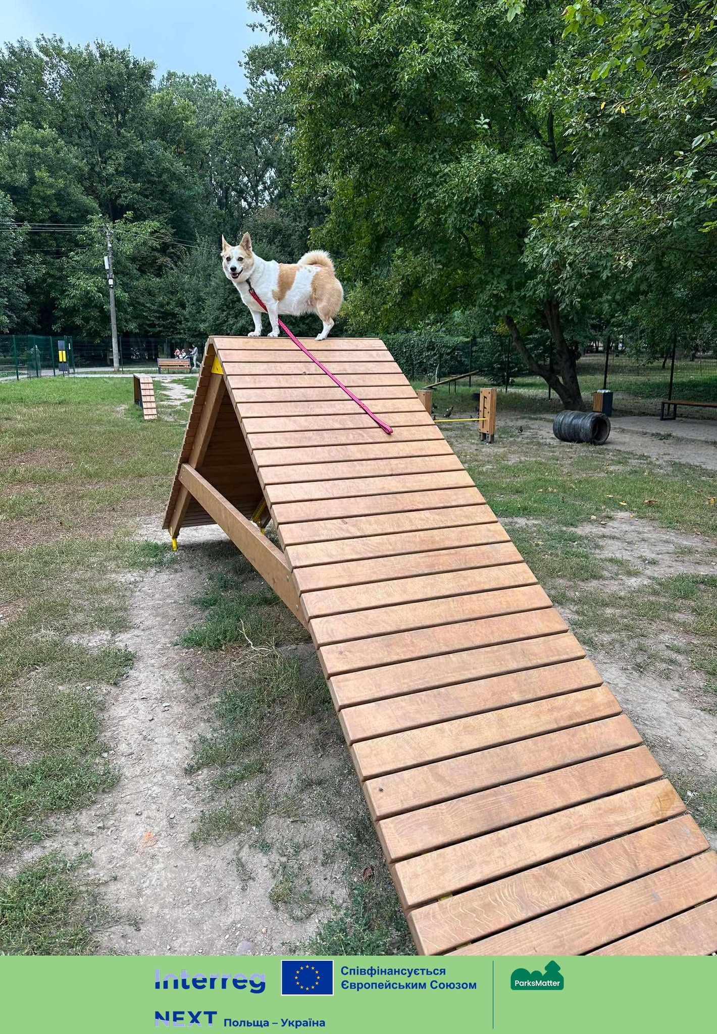 Так, у парку завершують роботи на майданчику для вигулу собак: уже встановлені тренажери для чотирилапих та лавки для їхніх господарів.