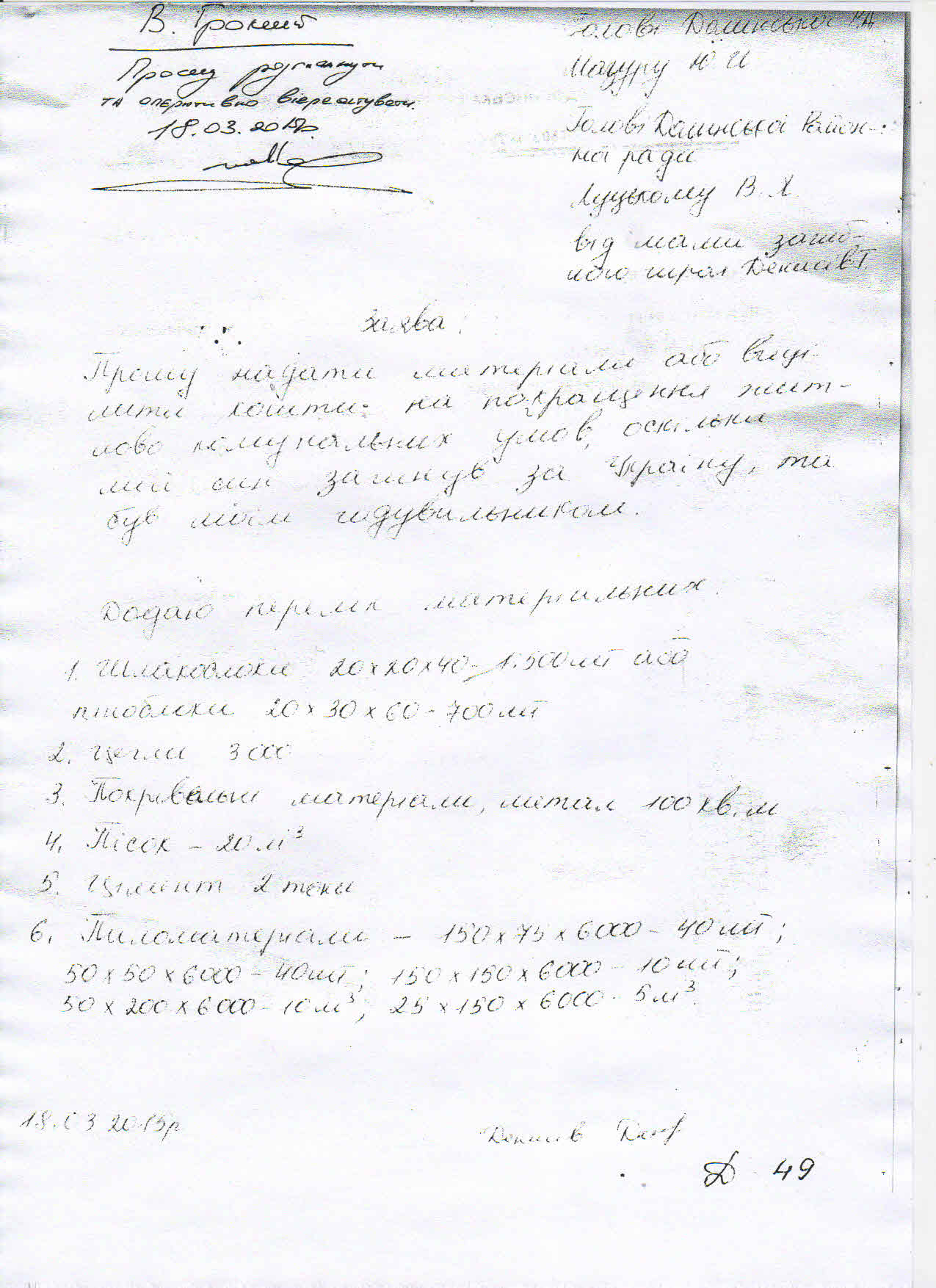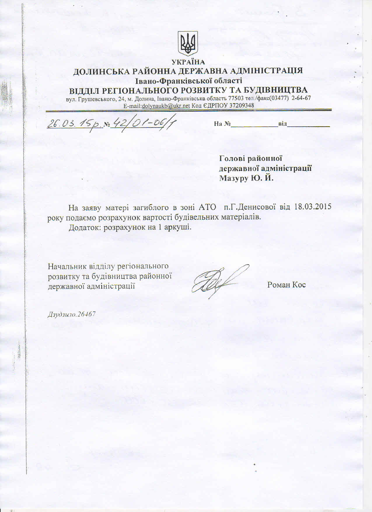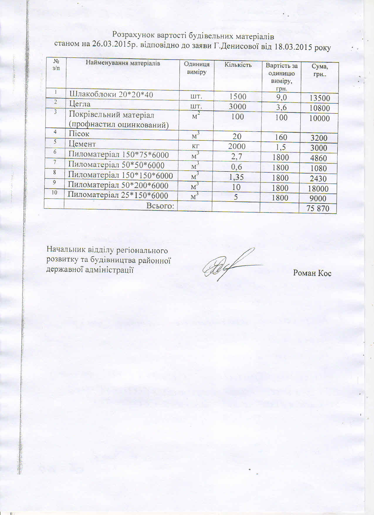 Ще 26 березня 2015 року начальником відділу регіонального розвитку та будівництва районної державної адміністрації Романом Косом був складений кошторис потреб, про які клопотала сім’я Денисівих (копія додається).
