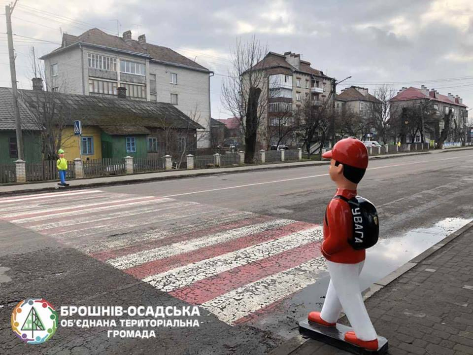 "Яскравий колір та схожість зі справжньою дитиною мають змусити водіїв пригальмувати перед пішохідним переходом. "Встановили манекени для безпеки руху школярів та мешканців селища. Це встановили з попереджувальною метою", – розповідає про задум голова Брошнів-Осадської ОТГ Назарій Іванів.