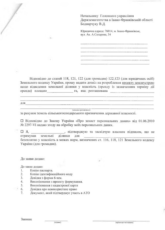 Для отримання земельної ділянки учасникам антитерористичної операції та членам сімей загиблих Героїв Майдану та загиблих учасників антитерористичної операції на Сході України необхідно звернутись в Головне управління Держземагентства в області (за адресою вул. Сахарова, 34, м. Івано-Франківськ, контактний телефон (0342) 55-22-39) із відповідними заявами.