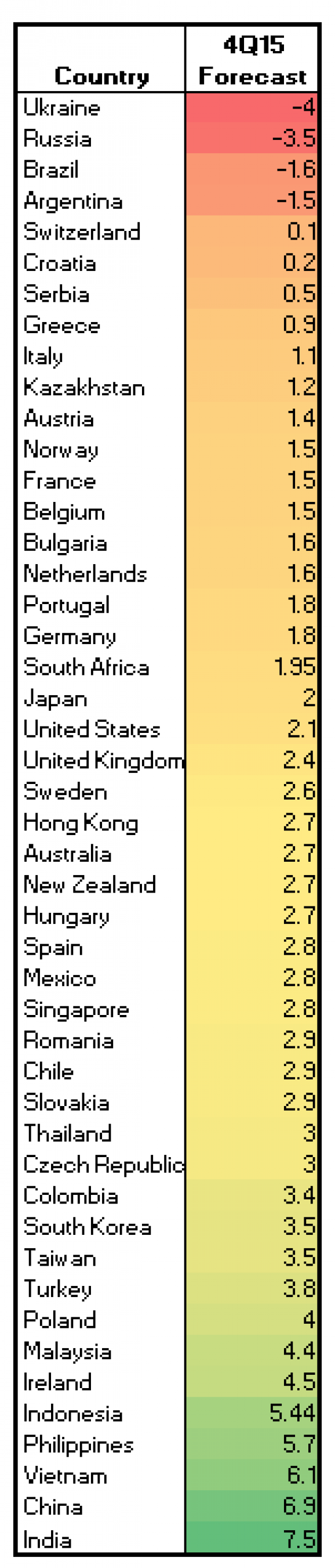 Наступною після України в рейтинзі розташувалася Росія, яка за підтримку терористів і анексію Криму потрапила під санкції і її ВВП скоротиться приблизно на 3,5% на тлі західних санкцій, падіння курсу рубля і цін на нафту.