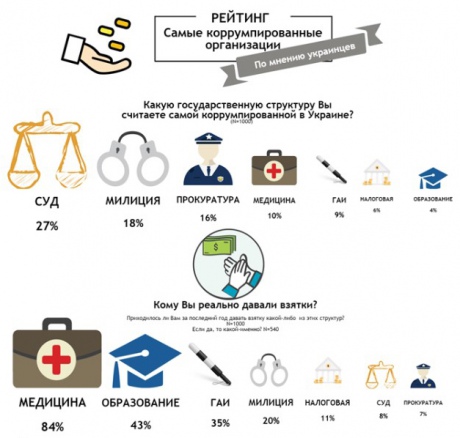 Незважаючи на такий результат, за минулий рік українці частіше давали хабарі в лікарнях та інших медичних установах - 84% хабарів опитаних припадало саме на цю сферу, в той час, як суд і прокуратура є найменш поширеними структурами дачі хабарів.