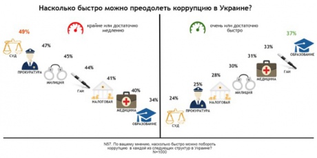 А судова система, завдяки своїй репутації, знову очолює топ організацій найменш схильних до викорінення корупції, майже половина українців впевнені, що викорінення хабарництва буде просуватися повільно або навіть вкрай повільно.