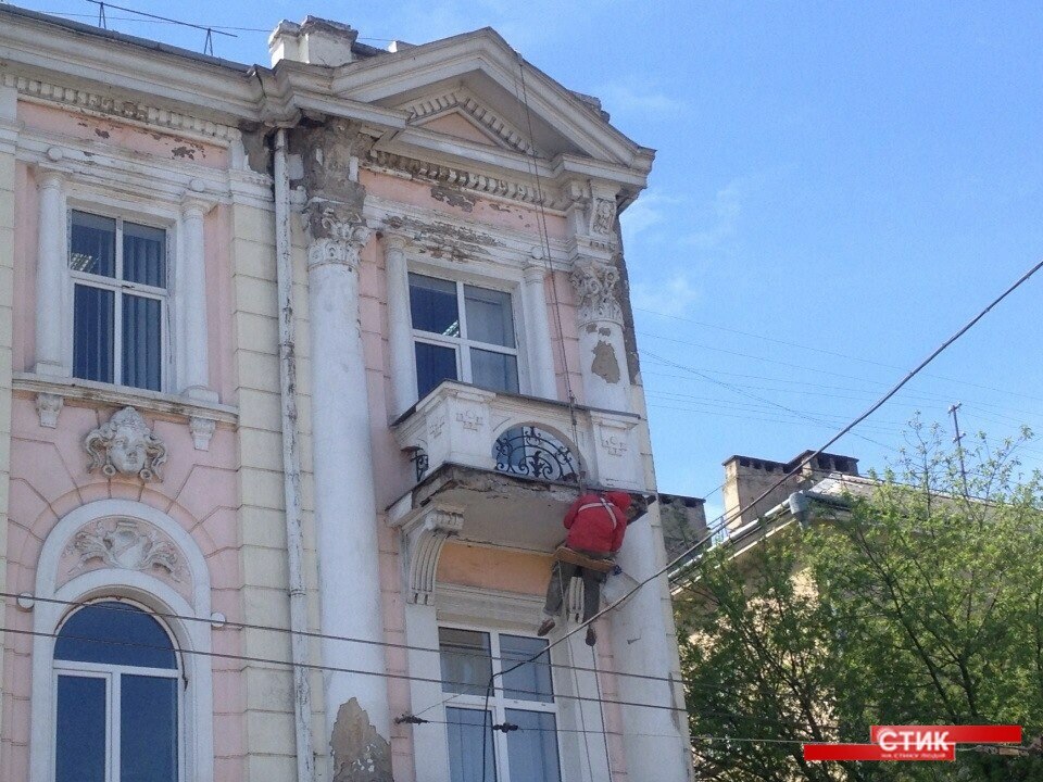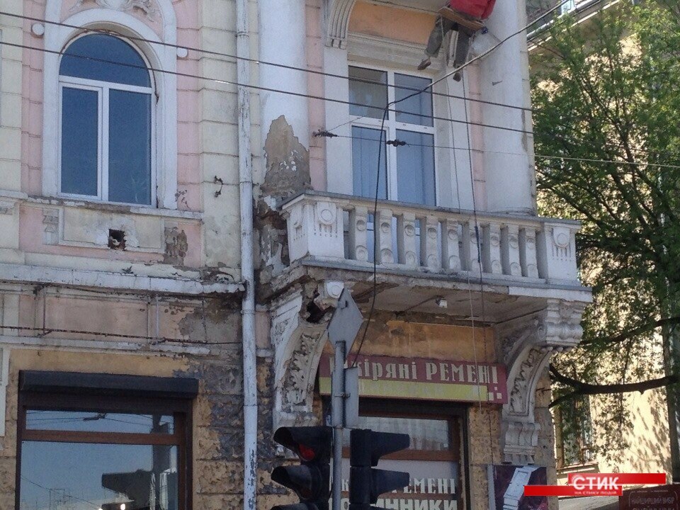 Фасад будинку, оздобленйи ліпкою, знаходиться в аварійному стані. Частина елементів оздоблення вже обсипалися.