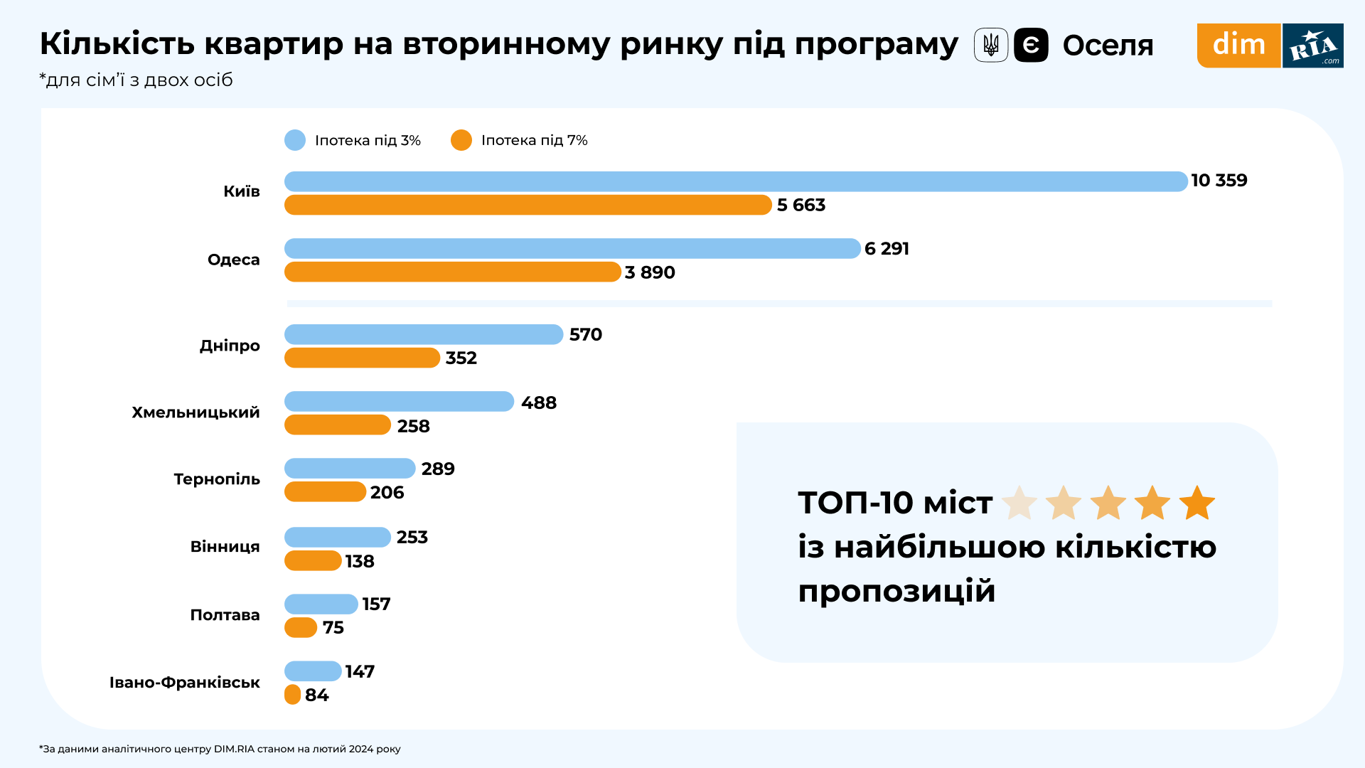 Наразі в Україні діє державна програма "єОселя". На вторинному ринку DIM.RIA станом на кінець лютого загальна кількість доступних варіантів складає 14 559 обʼєктів.