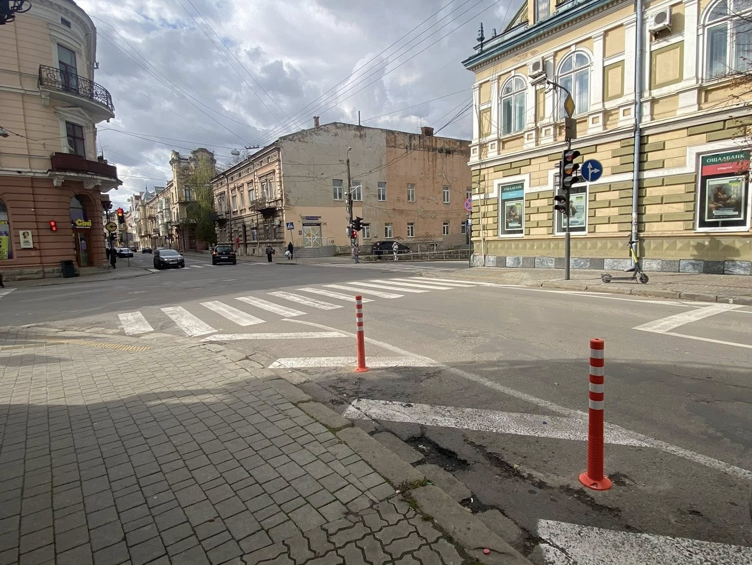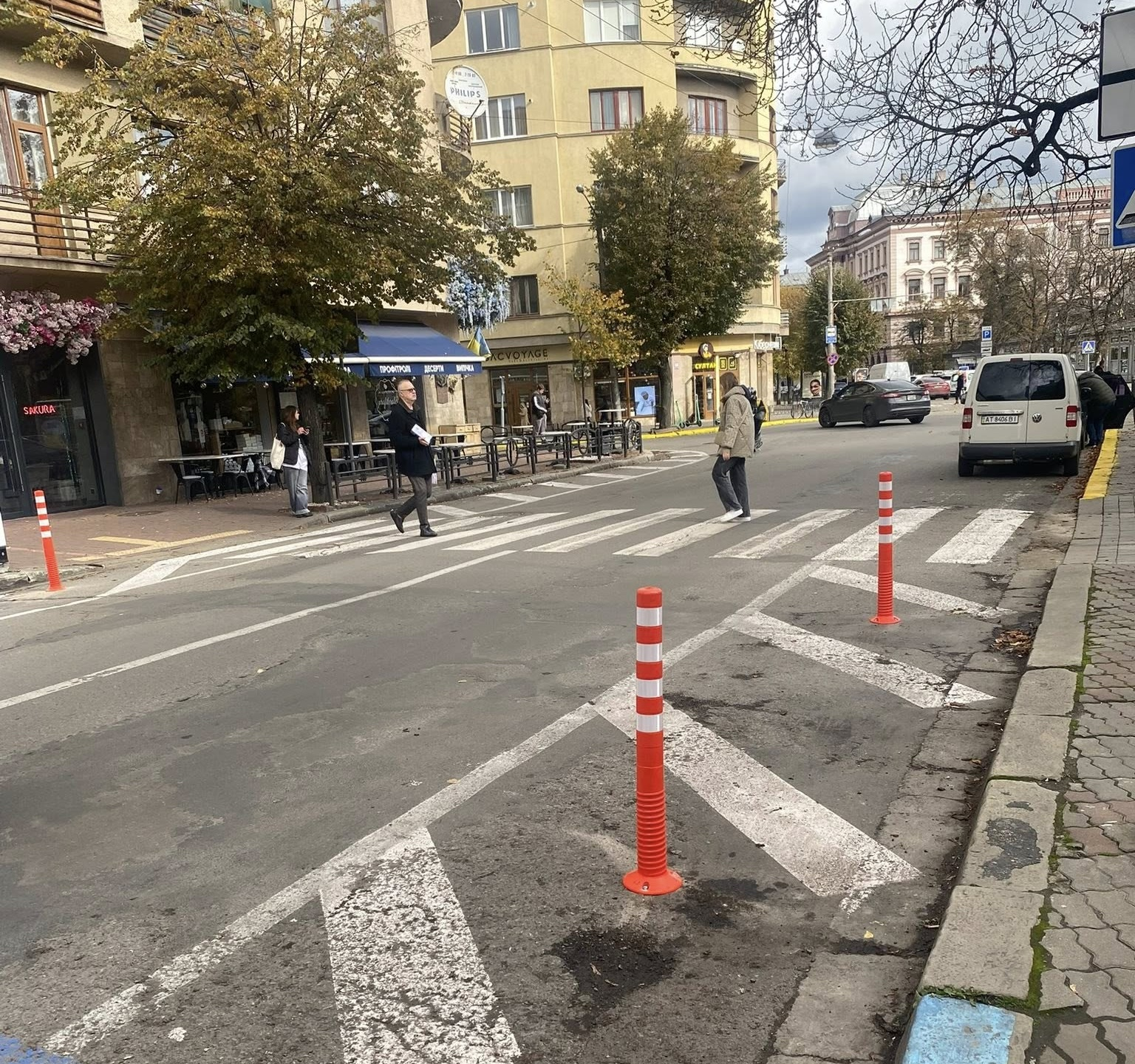 В Івано-Франківську розпочали встановлення делініаторів — пластикових обмежувачів, які мають фізично унеможливити паркування на ділянках із розміткою 1.16 біля пішохідних переходів.