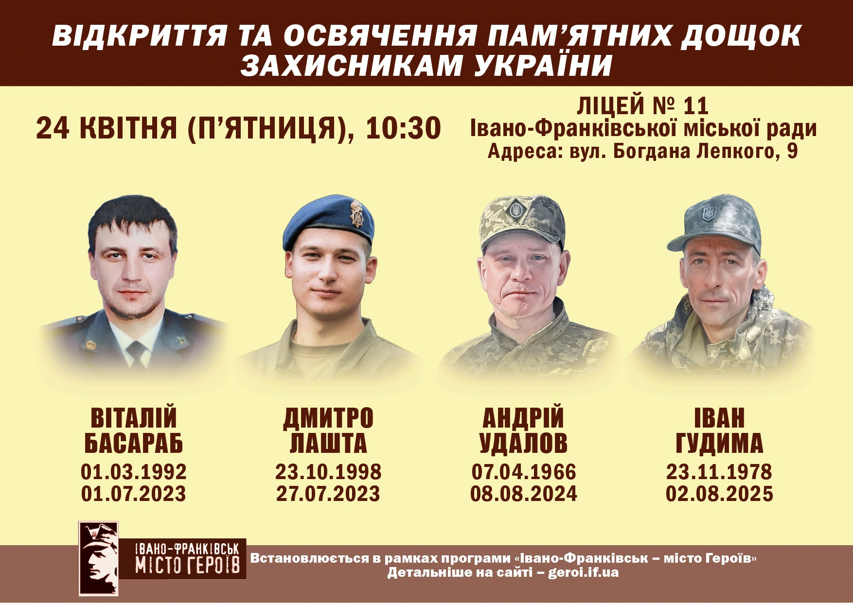 У п’ятницю, 24 квітня, в Івано-Франківську відкриють пам’ятні дошки чотирьом загиблим захисникам України.