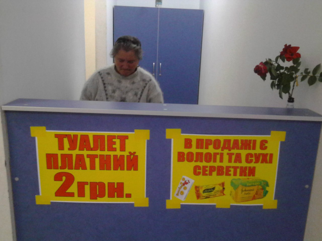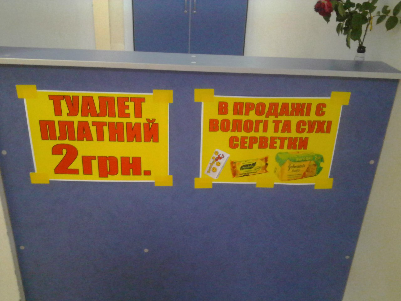 Піднімаюсь і бачу перед собою цілу «туалетну рецепцію». Напис на ній повідомляє, що «туалет платний – 2 грн», а ще на «рецепції» у «жіночки-гостеси» можна придбати вологі та сухі серветки і навіть їхній асортимент зображений у вигляді фотографій трохи нижче написів про оплату. Сєрвіс!..