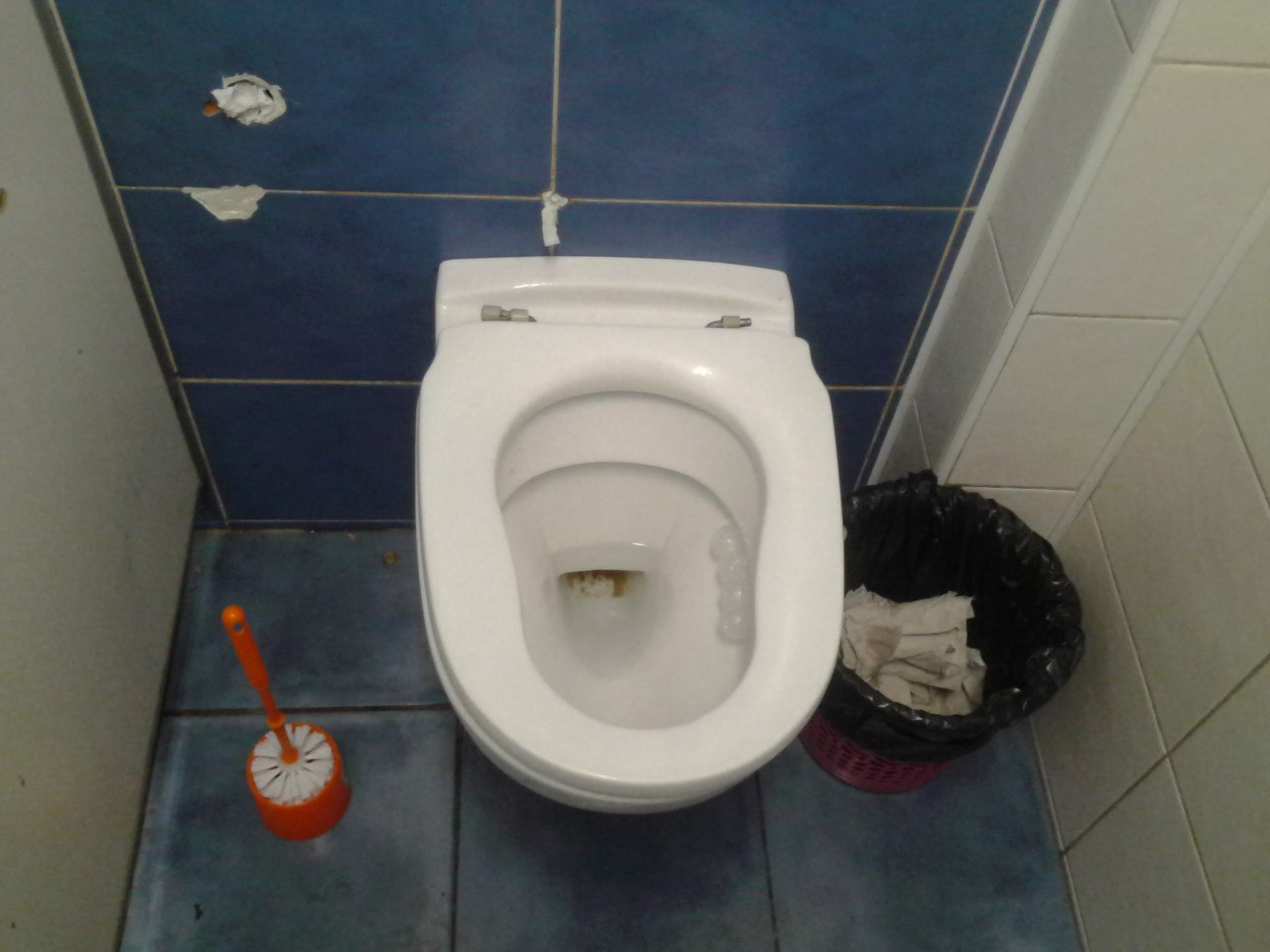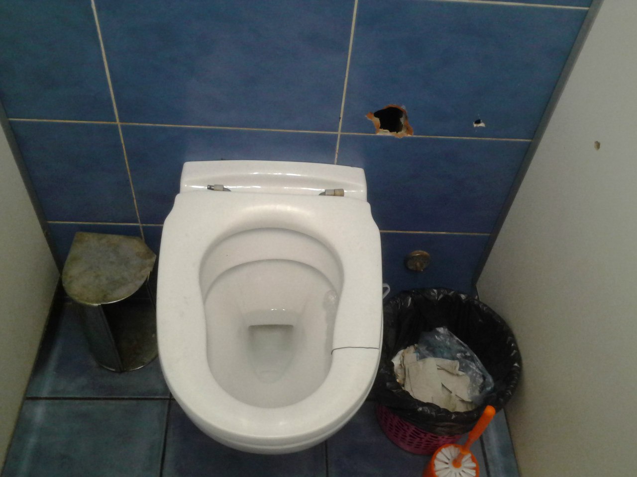 Щоправда, умови там були прежахливі: розбиті двері, вирвані дверні ручки, понівечені унітази, від диспенсеру для туалетного паперу залишились лише спогади, працював один умивальник, мила для рук не було взагалі, сушка для рук не працювала і гармонійно довершував цю картину жахливий сморід.