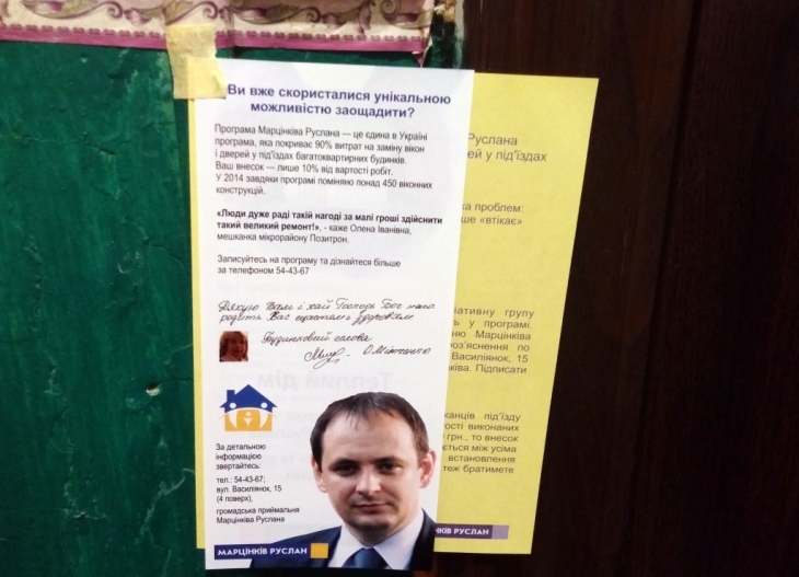 Двері помешкань франківців протягом останніх днів заклеюють листівками з рекламою "Програми Марцінківа Руслана "Теплий дім".