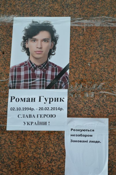 З вікна Івано-Франківської міської ради вивісили великий банер із фотографією франківського студента Романа Гурика, який вчора трагічно загинув у Києві від рук снайпера.