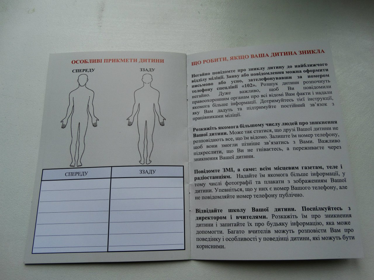 "Сьогодін ми розповсюджуємо ідентифікаційні картки дитини - це такий своєрідний паспорт, де міститься інформація необхідна нам для того, щоб розпочати пошуки дитини. Це і фотографія, і зовнішні ознаки дитини. Є певні рекомендації для батьків, якщо виникла ситуація, коли місце дитини не відоме", - розповідає начальник сектору кримiнальної мiлiцiї у справах дітей Управління МВС України в Івано-Франківській області, підполковник міліції Алла Лемчак.