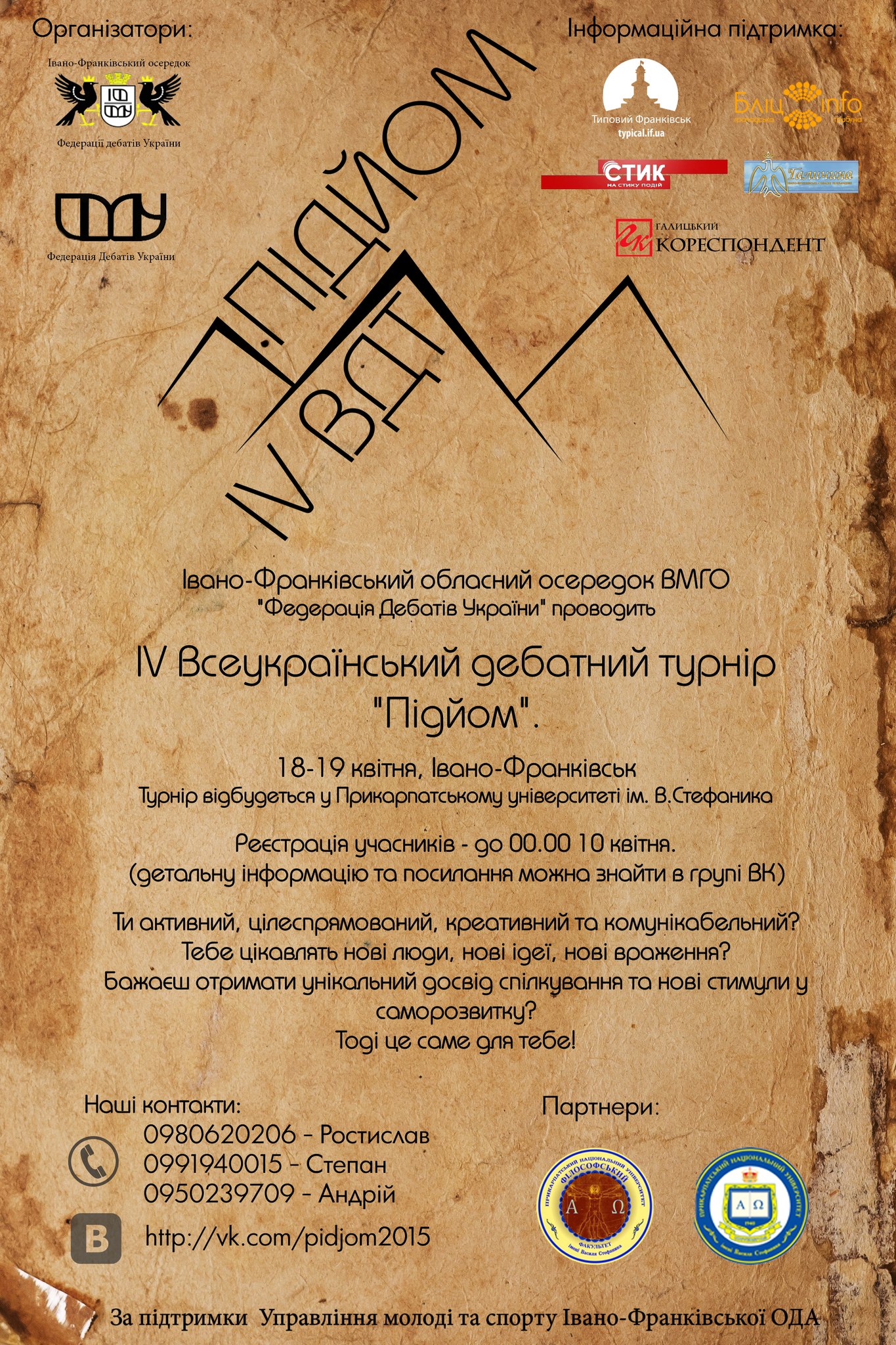 18-19 квітня 2015р. в м. Івано-Франківськ відбудеться четвертий Всеукраїнський дебатний турнір для новачків "Підйом".